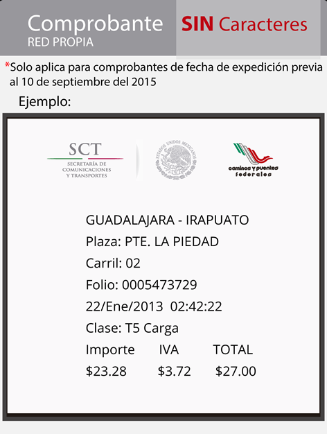 A continuación los dejamos con una imagen de cada uno de los comprobante de cruce de CAPUFE y los respectivos enlaces a los sitios de facturación segun el tipo de ticket de cruce obtenido.