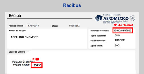 - Información con el PNR y Ticket para factura electrónica de un recibo de Aeroméxico