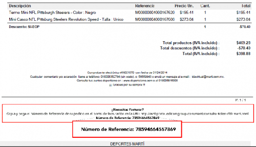 Donde aparece el número de referencia en tu voucher para poder generar las facturas electrónicas de tus compras en Deportes Martí vía el sitio web o telefónica