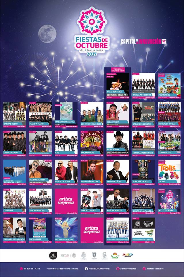 La cartelera del los artistas que se presentan en el Teatro del Pueblo de las Fiestas de Octubre 2017 ha sido publicada hace algunos días, como es costumbre la compartimos con ustedes para que pueden estar preparados y asistir a los show de los artistas de su elección en este recinto de las tradicionales Fiestas de Octubre de Guadalajara. Los siguientes artistas estarán ofreciendo sus shows en el Foro Principal de las Fiestas de Octubre 2017.