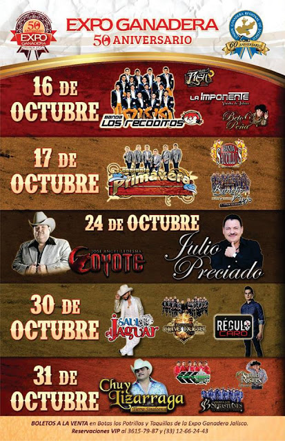 Para este año les dejamos la cartelera para los Bailes de la Expo Ganadera Jalisco 2015. Para todos aquellos que desean comprar los boletos para estos bailes les comentamos que hay que hacerlo con anticipación la venta de los boletos para los Bailes de la Expo Ganadera Jalisco, iniciaran desde el día 9 de Octubre los puntos de venta seran las taquilla de la Expo Ganadera asi como Botas los Potrillos. Para todos los demás eventos con costo por boleto durante el marco de la Expo Ganadera Jalisco como serian: charreadas, Enanitos Toreros, caballos Bailadores por mencionar algunos los boletos solo estarán a la venta el día que se realiza el evento en las taquillas del expo.