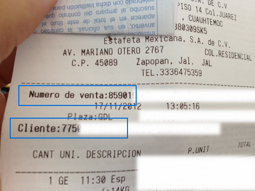 - La información que necesitamos para realizar nuestra facturación de Estafeta aparece en el ticket y corresponden al Número de Venta y a nuestro Numero de Cliente (sin el nombre). Esta información viene al principio de ticket y esta en negritas.