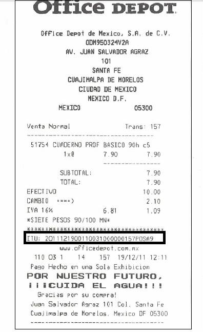 Para la facturación electrónica de nuestras compras en Office Depot México es importante contar con nuestro Ticket de Compra ya que de el sacaremos la información relevante para generar la factura electronica de nuestra compra en las tienda. La parte relevante del ticket de Office Depot es la que corresponde a un dato denominado ITU este numero aparece en nuestro ticket y dependiendo de su terminación nos indica la factibilidad de realizar la facturación electrónica por medio del sitio web o bien hacer una consulta para generar una factura previamente generada en la linea de cajas de Office Depot al momento que hicimos nuestro pago.